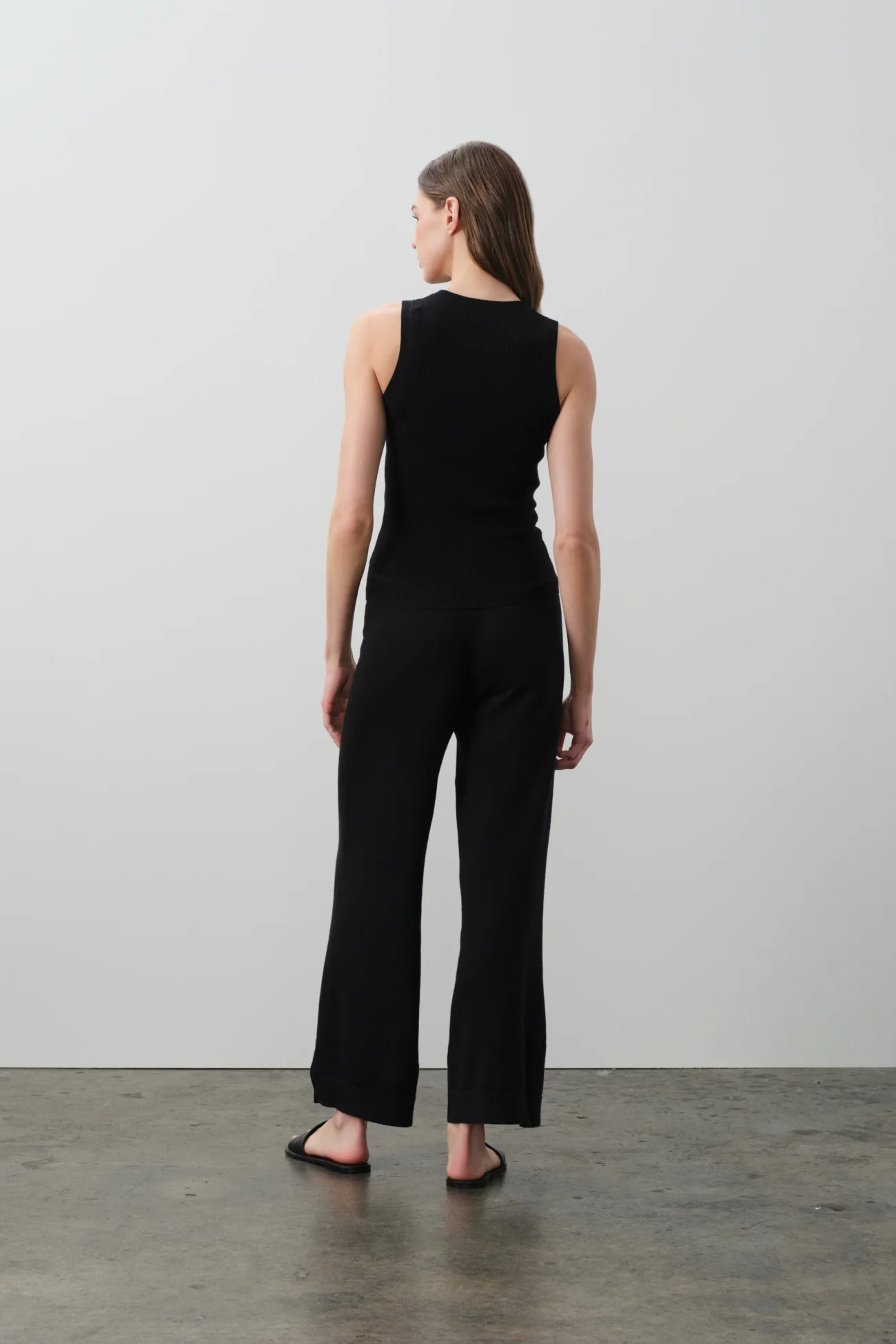 Subtly cropped wide-leg pant featuring a V-back seam detail and hem slits, finished with a clean ribbed pull-on waistband and crafted in a plush terry stitch for a refined, relaxed feel.