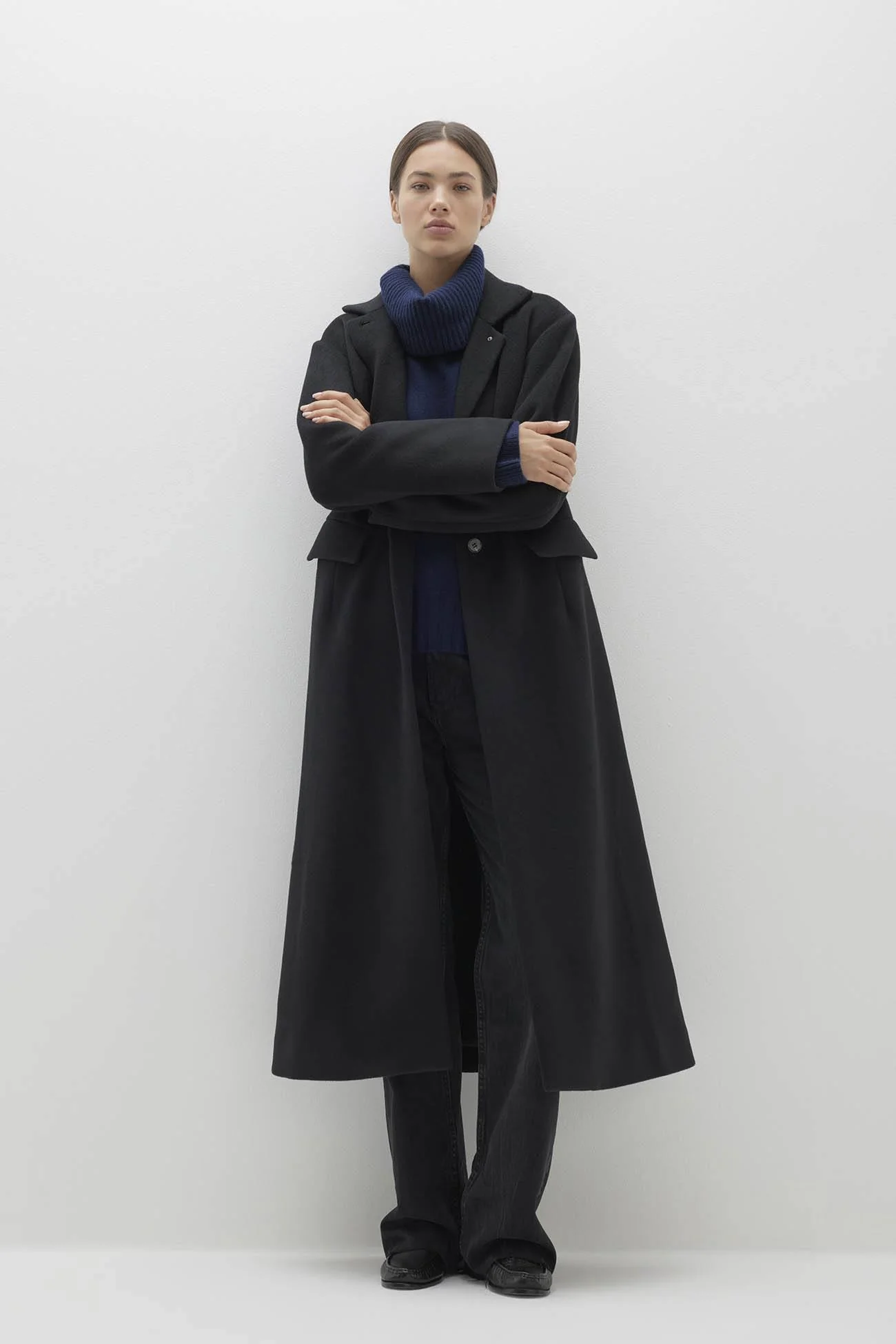 The Ottilie longline coat is a timeless outerwear piece, made from a luxurious wool blend. With a button-front closure, slit pockets, and a charming detail at the back, this coat combines sophistication and practicality.